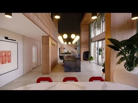 The interior design is quirky and fun from start to finish. The color palette of mint green, cobalt blue, and bright red set on a backdrop of natural and tonal finishes help this project stand out, and exemplify that buzzing energy radiating through Nashville as of late. The blue quartzite reception desk greets tenants and visitors alike and welcomes them into the space. In the two-story lobby, a curved feature stair brings you to a “catwalk” like mezzanine which concludes at a cozy library. On the third floor, the clubroom’s focal point is its cylindrical floating vapor fireplace, backed by a custom wood dividing wall to create space for multiple tenants to enjoy the clubroom at once. The project’s many other amenities include a large coworking zone, generous fitness center, a luxurious pool deck, a bike lounge, and a pet spa.